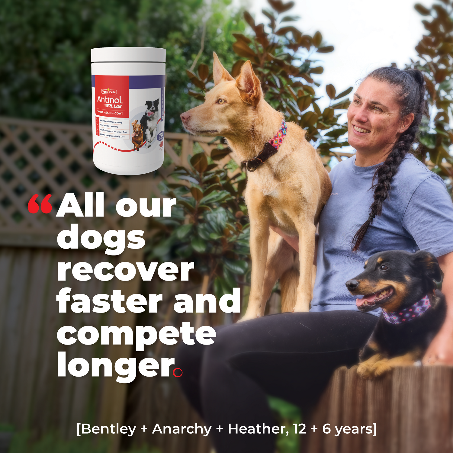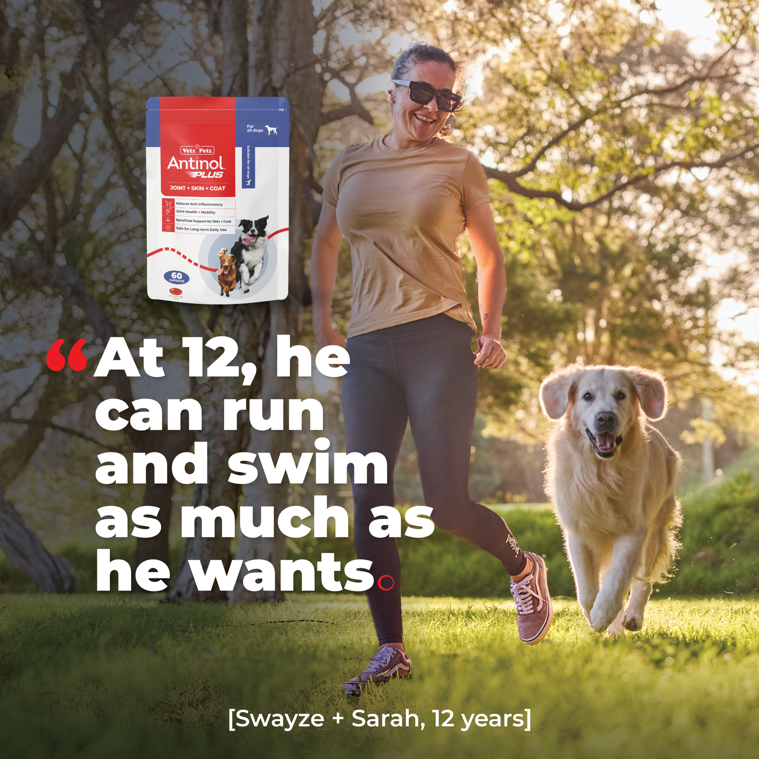 Antinol® Plus is an all-natural supplement that is changing dog’s lives for the better. Each tiny capsule is made from a patented blend of marine lipid oils that are fully traceable, sustainably sourced and free from preservatives and fillers. Antinol® Plus can be used daily as a natural anti-inflammatory to help support joint and mobility health, help maintain skin and coat condition, and serve as a wellness supplement for those looking to be proactive about their dog’s health.